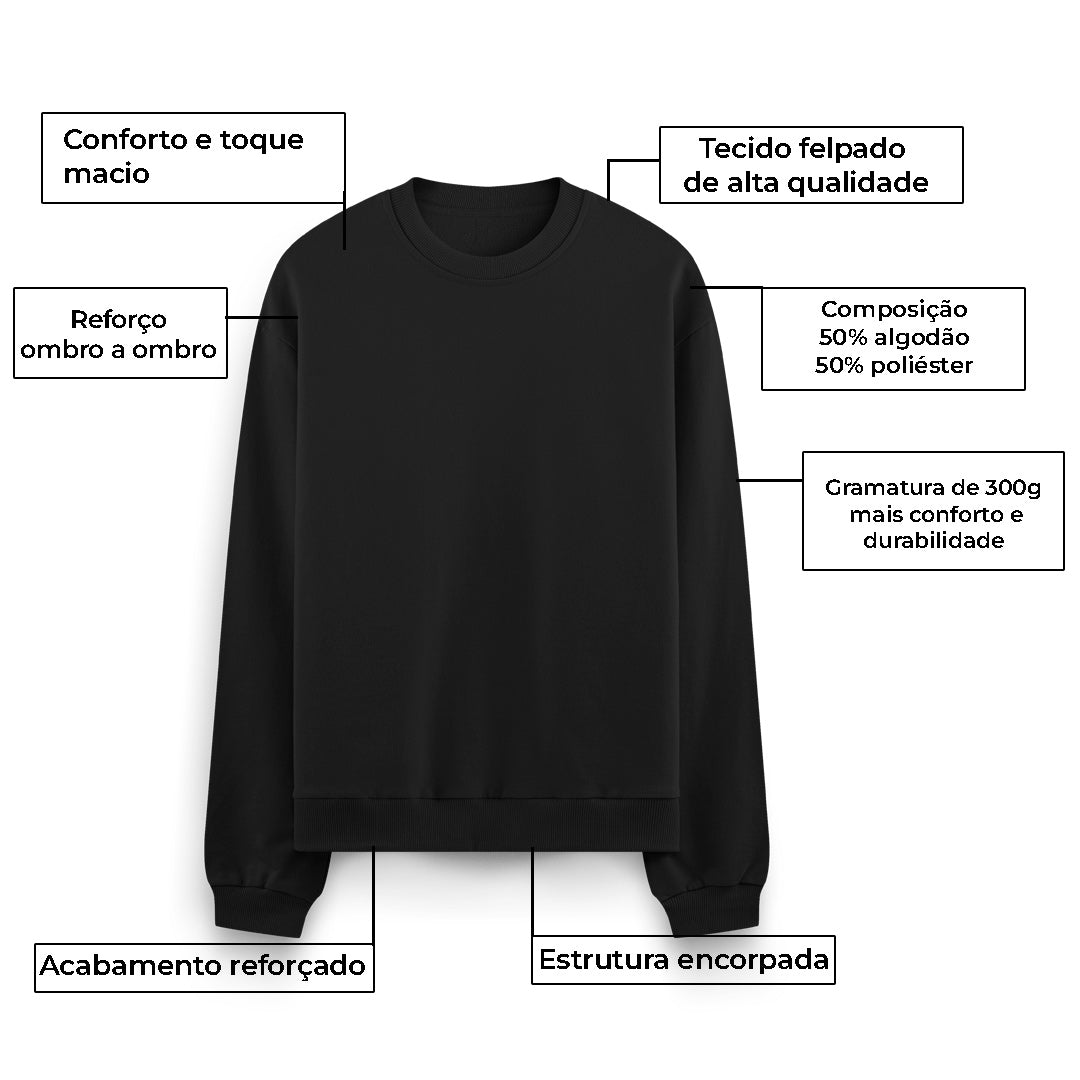 50% algodão e 50% poliester. Toque Macio e mais encorpado. Gramatura 300gGola, punhos e barra em ribana canelada 2x1 com elastano. Reforço ombro a ombro, gola com anel de 2,7 cm e pesponto de 2 agulhas. Estampa em DTF premium.
